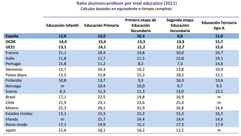 Quizás alguno podría pensar en que las condiciones de trabajo son mucho peores. Pero en las ratios más clásicas tampoco hay mucha diferencia. Por ejemplo, en España, el número de estudiantes por aula en Primaria es de 20,1, por debajo de la media de la OCDE (21,3) y casi al mismo nivel que la UE-21 (19,9).