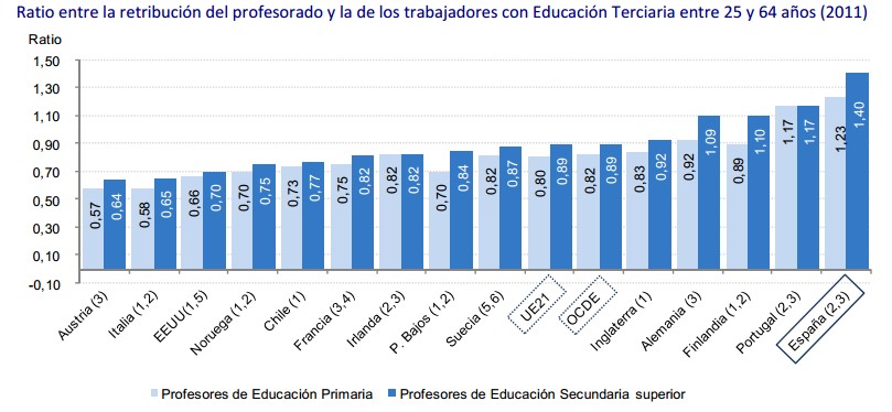 Uno de los aspectos que destaca el estudio presentado es el relativo al sueldo del profesorado. Si se compara el salario de los profesores en España con el salario medio en el conjunto de los países de la OCDE y de la UE-21, se observa que en nuestro país el salario inicial es más alto tanto en Educación Primaria, como en Educación Secundaria. Incluso después de 15 años de carrera, los salarios están por encima de la media en ambos casos.