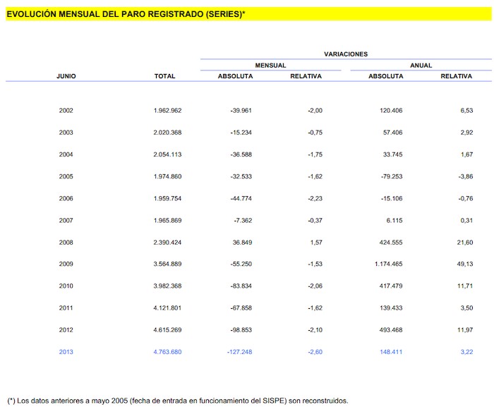 Así, en términos desestacionalizados, o lo que es lo mismo, sin tener en cuenta el peso del 'efecto verano', el desempleo se ha incrementado en 996 personas en junio, hasta alcanzar los 4.876.323 parados. Por otro lado, si se compara el mes de junio con ese mismo mes de 2012, el paro también se ha elevado: en 148.411 personas más. Aunque pueda parecer una mala noticia, se trata del menor incremento interanual que se registra en junio desde desde 2007, cuando el paro bajó en 31.297 personas, exceptuando 2011, donde se incrementó en 123.457 parados.