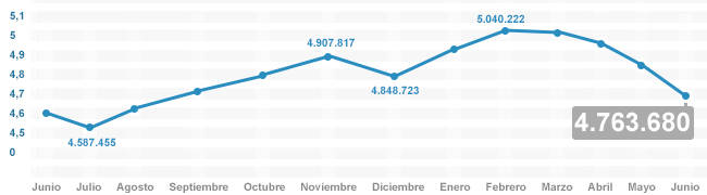 Con esta bajada, la cuarta consecutiva del año, junio da un respiro al mercado laboral español y el número oficial de parados se sitúa en 4.763.690 personas.