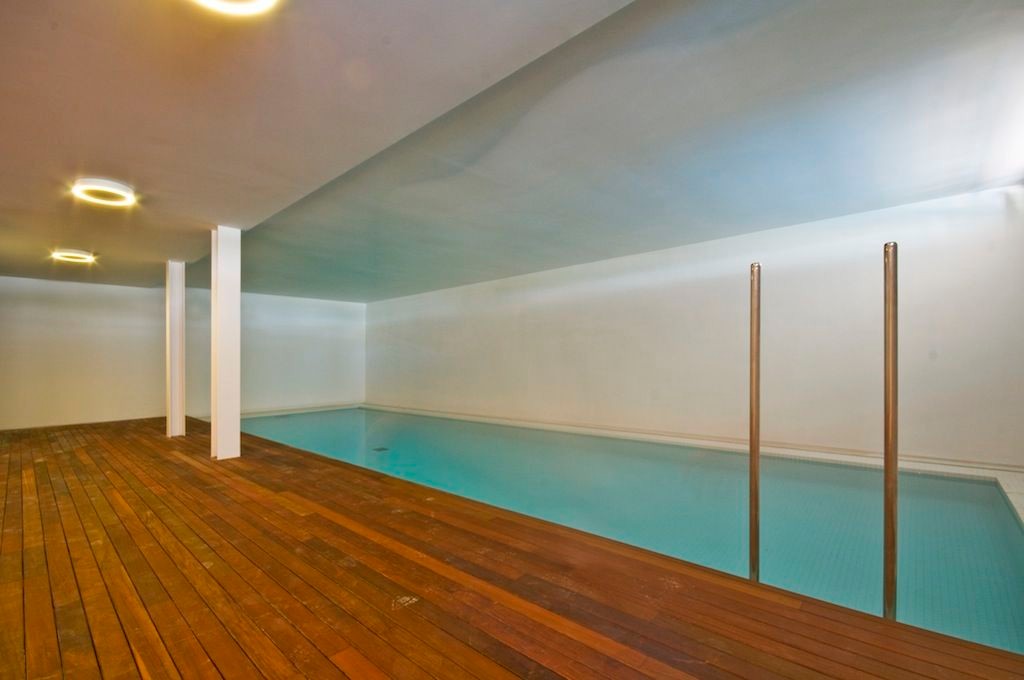 La planta inferior con piscina interior, sauna, área de bar, discoteca y comedor para hasta 20 comensales. El edificio principal dispone de cinco dormitorios dobles, cada uno con su baño.