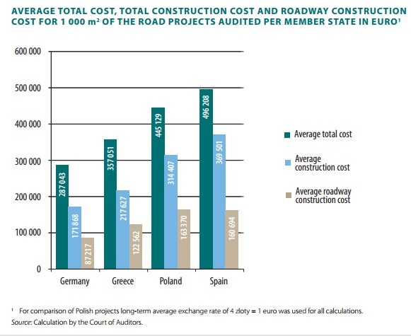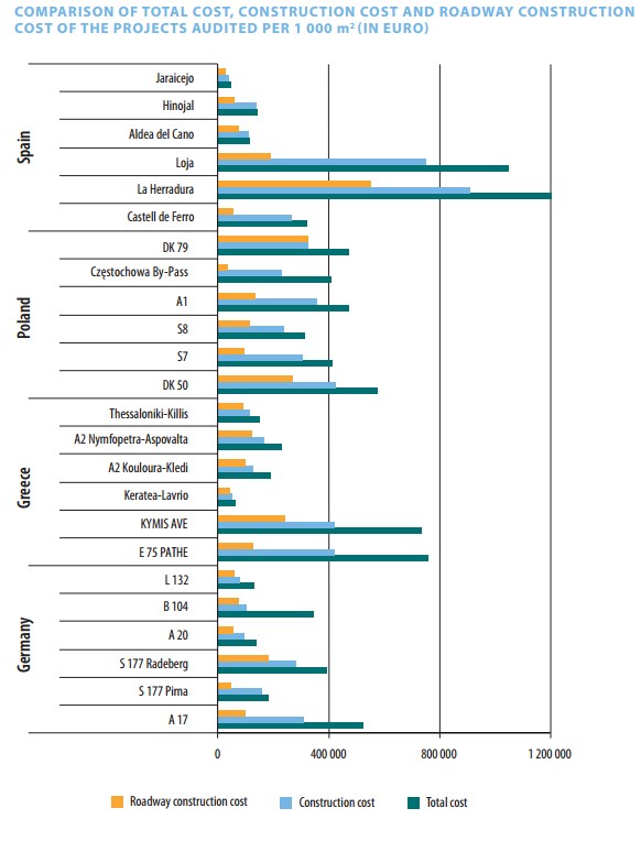 El resultado del análisis no deja en muy buen lugar a los proyectos españoles. El Tribunal destaca las desigualdades en el coste de los proyectos en los diferentes países, donde la comparativa más sangrante se produce entre España y Alemania. Mientras que en el país germano el coste medio total de carreteras por cada 1.000 metros cuadrados es de 287.000 euros, los subvencionados por la UE en España necesitan casi 500.000 euros, casi el doble.