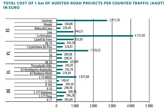 En este punto también vuelve a aparecer España como un mal ejemplo. El Informe analiza 6 proyectos españoles (tres en Andalucía y tres en Extremadura) y calcula el coste de la construcción de cada kilómetro de estas carreteras teniendo en cuenta el número de usuarios promedio diario.
