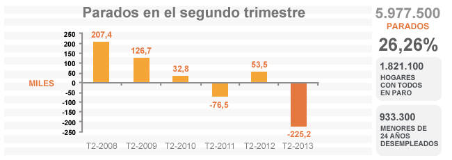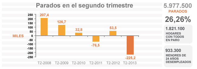 El ministro de Economía, Luis de Guindos, vaticinaba esta semana "los buenos datos de empleo" que desvelaría la EPA, adelantando que las cifras del segundo trimestre serían mejores que las del primero. A pesar de que hay que tener en cuenta que el aumento de las contrataciones debido a la campaña de verano suele reducir el número de desempleados en el segundo trimestre, cabe destacar que el descenso trimestral del desempleo es el mayor observado desde 2008.