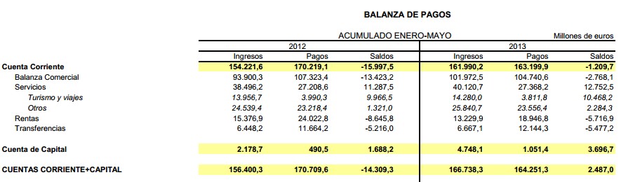 -- Balanza por cuenta corriente: el déficit acumulado de la balanza por cuenta corriente se situó en 1.209,7 millones de euros en los cinco primeros meses de este año, lo que representa un descenso del 92,4% respecto a los 15.997,5 millones registrados en el mismo periodo de 2012. Esta disminución se debió principalmente a la "notable" corrección del déficit comercial y a la mejora de los saldos de rentas y de servicios, mientras que el déficit de la balanza de transferencias corrientes se incrementó ligeramente.
