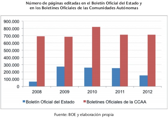 Sin embargo, este extremo no parece ser el caso de España a la vista de la hipertrofia regulatoria que ostentan las Administraciones Públicas. Basta observar el número de normas que se aprueban cada año: sólo en 2011, y sin contar la Administración Local, se adoptaron 2.896 normas a nivel estatal y 10.261 a nivel autonómico, sumando más de 13.000 leyes en total; además, el Boletín Oficial del Estado (BOE) publicó un total de 151.133 páginas el pasado año, que, unidas a las 715.009 páginas de Diarios y Boletines Oficiales de las comunidades autónomas, hacen un total de 866.142 folios de normativa.