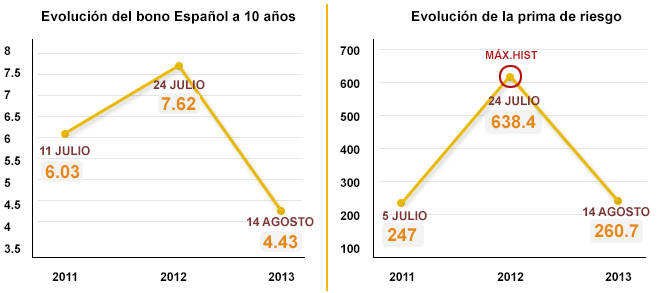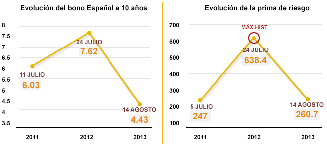 La aversión al riesgo por parte de los inversores extranjeros continúa bajando. Así, el diferencial entre la deuda española y la alemana ha marcado este miércoles mínimos de hace dos años. Hay que recordar que en ese escenario de hace dos años la sombra del rescate acechaban a las finanzas de dos países, España e Italia. Fue precisamente en agosto de 2011 cuando la tensión llevó al entonces presidente del Banco Central Europeo, Jean Claude Trichet, a anunciar la compra de deuda española para aliviar las tensiones del mercado. Ese 'parche' duró apenas unos meses y la prima de riesgo volvió a inflarse hasta tocar su máximo histórico el 24 de julio de 2012. La prima de riesgo llegó entonces hasta los 638 puntos básicos.