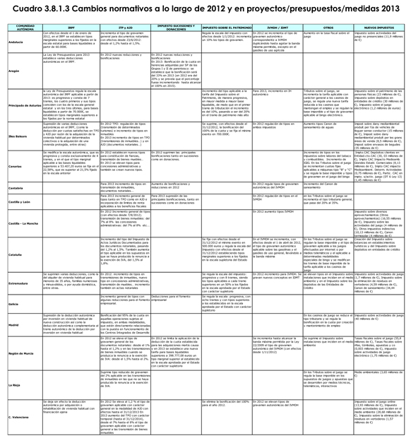 Tiene especial relevancia el aumento de los tipos impositivos del Impuesto del Patrimonio o la reducción del mínimo exento; el aumento del tipo impositivo del Impuesto de Transmisiones Patrimoniales y Actos Jurídicos Documentados; la aplicación del tramo autonómico del Impuesto sobre las ventas minoristas de determinados hidrocarburos; el aumento del canon de saneamiento; o el aumento del Impuesto de Sucesiones y Donaciones en determinados casos.