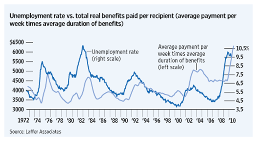 En el año 2010, el economista Arthur Laffer, conocido por sus estudios tributarios, publicó en el Wall Street Journal una polémica tribuna de análisis en la que comparó dos variables: el alcance del desempleo y la prestación media del seguro de paro. Evaluando ambos indicadores para un periodo de casi cuarenta años, Laffer llegó a la conclusión de que aumentar la prestación del subsidio de desempleo anima a permanecer en el paro y desincentiva la búsqueda de trabajo.