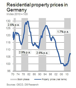 "No hay burbuja inmobiliaria en Alemania", así de rotundo se muestra Deutsche Bank en un informe sobre el ladrillo germano. La entidad rechaza por completo la posibilidad de que en este país el precio de la vivienda pueda hincharse de forma desmedida. Para justificar esta idea la firma recuerda Alemania ha registrado desde el año 1970 cuatro fases de crecimientos significativos en el precio de la vivienda. Ciclos que se han caracterizado por cambios en las expectativas de inflación, de los ingresos y del acceso al crédito