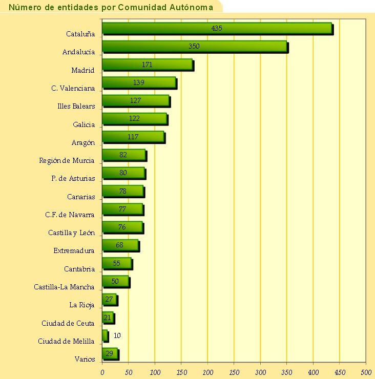 Las sociedades mercantiles (576), los consorcios (569) y las fundaciones (516) constituyen casi el 80% de los entes autonómicos aún vigentes. Cataluña acumula el mayor número de entidades, con 435 (20,6% del total), seguida de Andalucía (350) y la Comunidad de Madrid (171), aunque ésta última mantiene una administración paralela casi un 60% inferior a la catalana.