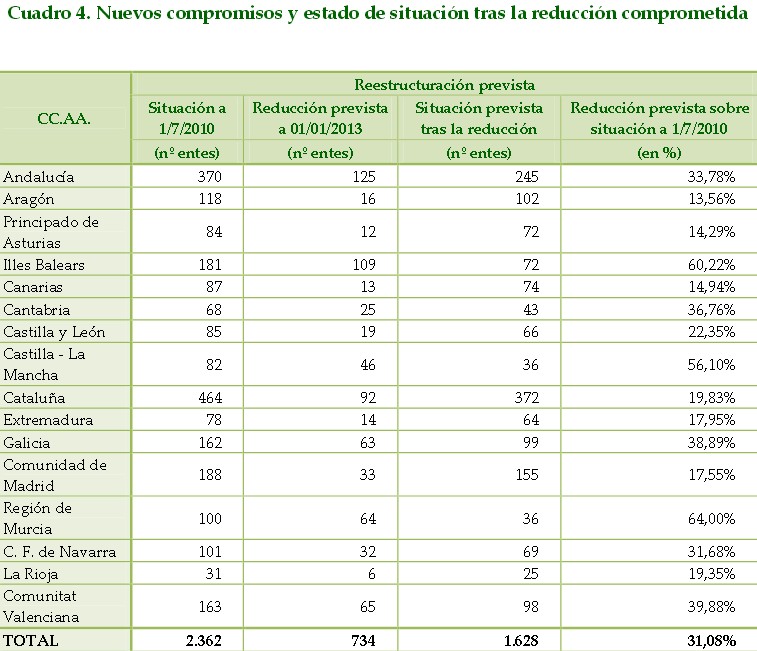 En marzo de 2010, con José Luis Rodríguez Zapatero en el poder, las CCAA prometieron eliminar 515 entes antes de 2013. De este modo, el plan inicial para reordenar el sector público autonómico preveía pasar de las 2.362 entidades públicas existentes en julio de 2010 a 1.847 a finales de 2012, lo que implicaba una reducción del 21,8%.