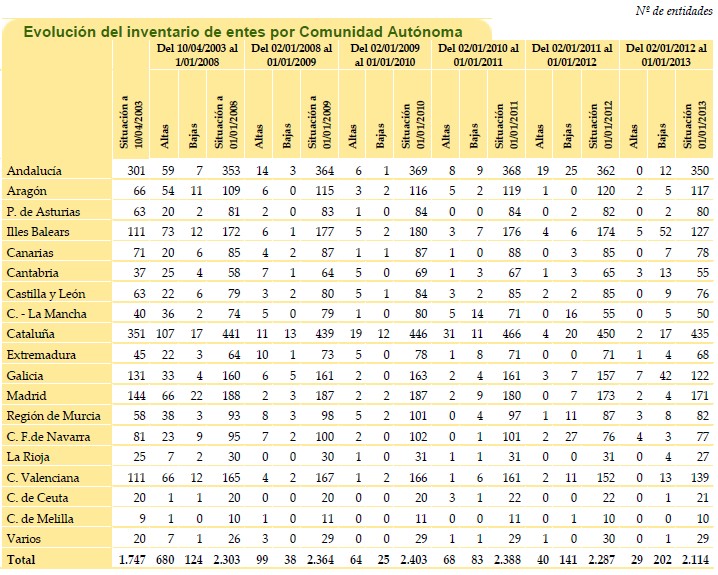 Entre las regiones más grandes, Cataluña cuenta con 84 entes más que en 2003 (crecimiento del 24%); Andalucía con 49 (16,3% más); Madrid con 27 (19%); Valencia con 28 (25% extra); Baleares con 16 (14,4%); y Aragón con 51 (77,3%). Por el contrario, Galicia y Navarra son las únicas que han reducido entes en la última década (9 y 4, respectivamente), según el último inventario oficial de Hacienda.