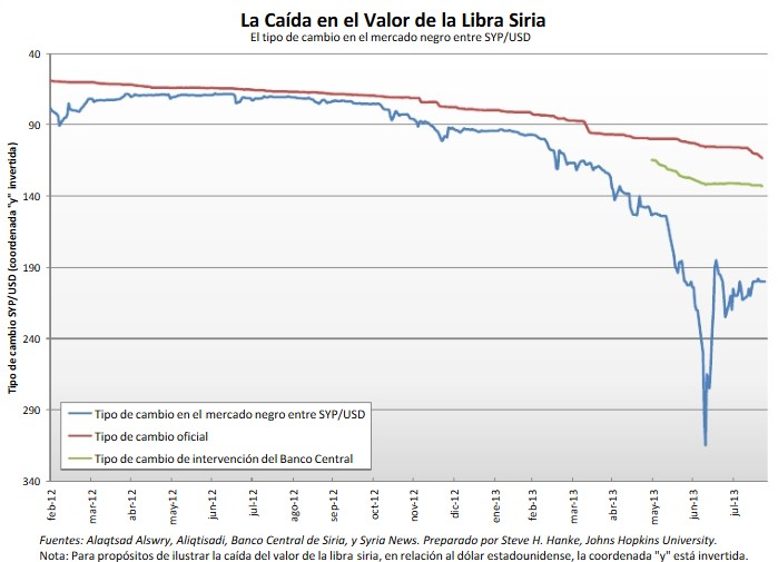 Así las cosas, Hanke calcula que el tipo de cambio con el dólar de la lira siria no es de 133/1 como afirman las autoridades sirias. Estudiando el mercado negro, los trabajos del experto estadounidense en materia monetaria hablan de un tipo de cambio de 205/1.
