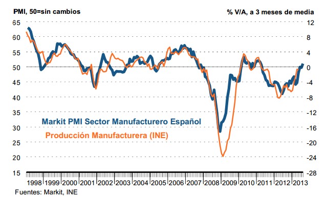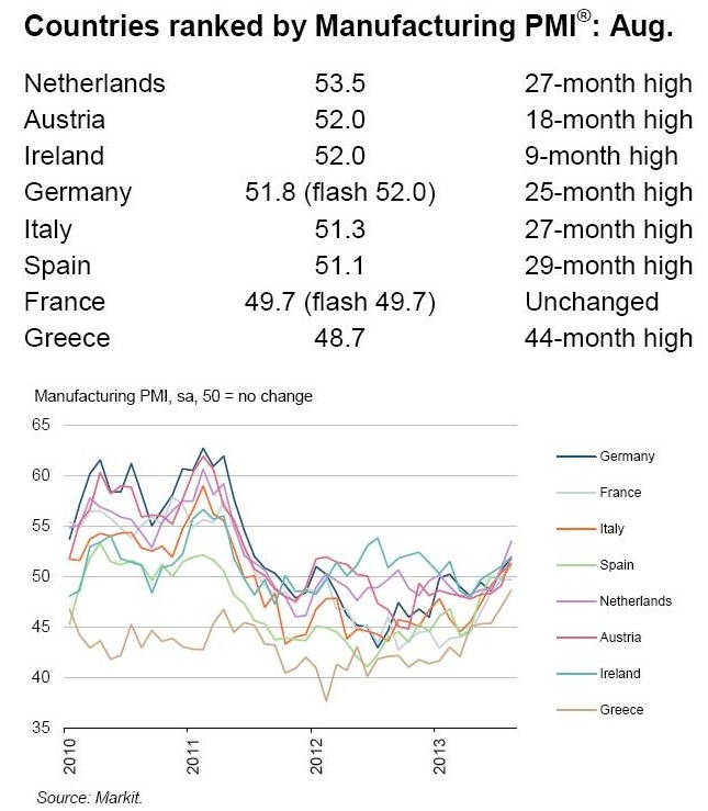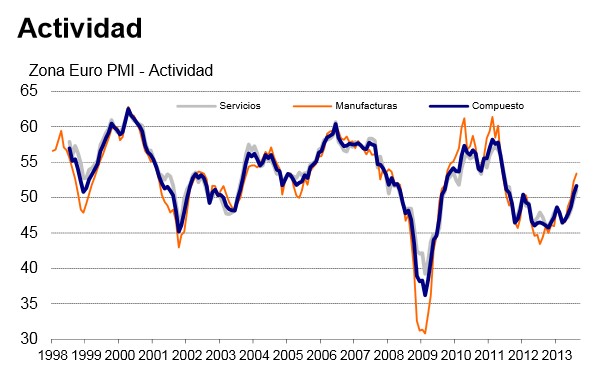 La mejora del sector exterior se explica, igualmente, por la salida de la recesión que está experimentando ya la economía de la zona euro, cuya producción industrial volvió a crecer en agosto. El PMI manufacturero avanzó hasta los 51,4 puntos, su mejor dato en 26 meses, destacando el crecimiento experimentado en Alemania, Países Bajos, Italia, Austria e Irlanda. Todos los PMI nacionales mejoraron, a excepción de Francia. La industria gala y griega fueron las únicas que registraron un índice de actividad inferior a 50 puntos.