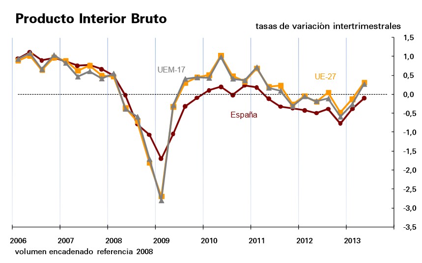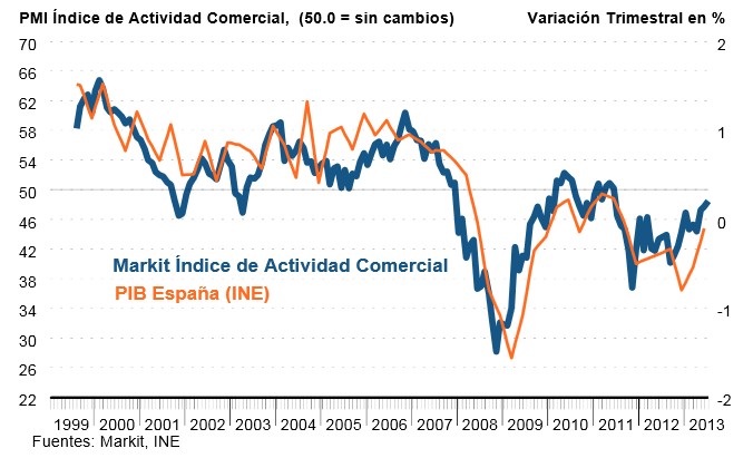 Andrew Harker, economista de Markit, señala al respecto que el sector servicios español estuvo "cerca de registrar un cambio de dirección en julio, ya que el ritmo de contracción de la actividad se ralentizó de nuevo durante el mes. Si la tendencia actual se mantiene, podríamos estar en camino de ver un retorno al crecimiento del PIB hacia finales del año". Y esto es, precisamente, lo que refleja el Indicador Sintético de Actividad que elabora el Ministerio de Economía, ya que repunta un 0,1% en el segundo trimestre, lo cual avanza un ligero crecimiento del PIB durante la segunda mitad de 2013.