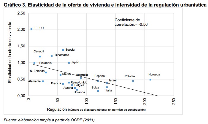 España es el quinto país con una intervención más restrictiva en materia urbanística. Esto hace que el mercado del suelo en España sea especialmente rígido, configurando así una oferta inelástica que provoca numerosas deficiencias. No en vano, el suelo abunda en España, pero "la regulación crea una escasez artificial" y "ralentiza su urbanización", añade el informe.