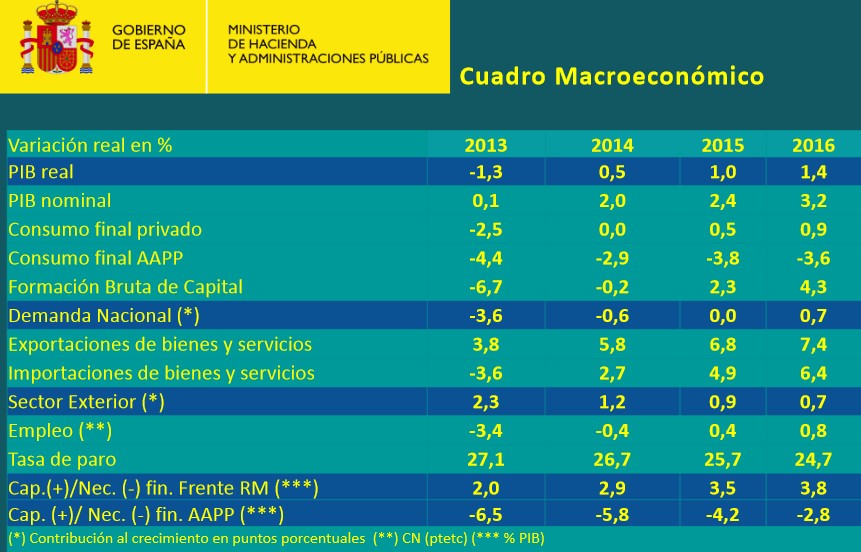 Según el anterior cuadro macro, con una previsión de crecimiento del 0,5% en 2014, Hacienda contemplaba recortar un 2,9% interanual el "consumo final de las Administraciones Públicas", equivalente a unos 6.000 millones de euros. Bajo esta partida de gasto, próxima a los 200.000 millones de euros, se engloba gran parte de la remuneración de los empleados públicos y la provisión de servicios básicos. Aún así se trataría de un recorte muy inferior al aplicado en 2012 y al previsto en 2013 (-4,4%).