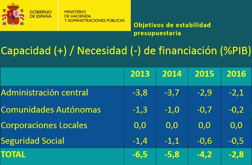 El conjunto de las Administraciones Públicas deberá reducir el déficit desde el 6,5% previsto en 2013 hasta el 5,8% en 2014, lo cual equivale a un ajuste del 0,7% del PIB, algo más de 7.000 millones de euros, siempre y cuando no se produzcan desviaciones inesperadas durante el presente ejercicio. Sin embargo, excluyendo la Seguridad Social, que constituye un sistema aparte, el ajuste del Gobierno central apenas asciende a 1.000 millones (del 3,8 al 3,7% del PIB) y el de las comunidades autónomas a unos 3.000 millones (del 1,3 al 1% en 2014).