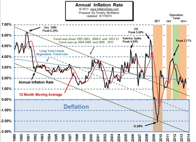 3. Por otro lado, los niveles de inflación se mantienen muy bajos, e incluso han sorprendido a la baja en últimos meses. Cace recordar que el objetivo de la FED es una tasa de inflación del 2% y en estos momentos ronda el 1,4%. Bernanke pretende evitar a toda costa la deflación (caída de precios).