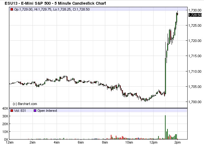 La reacción a este inesperado anuncio fue inmediata. La Bolsa de EEUU y, con ella, las principales plazas bursátiles reaccionaron al alza. Wall Street cerró el miércoles con nuevos récords históricos de los índices Dow Jones de Industriales y S&P 500. En concreto, el Dow subió un 0,95% y cerró a 15.676,94 unidades, mientras que el S&P ganó un 1,22 % y quedó en 1.725,52