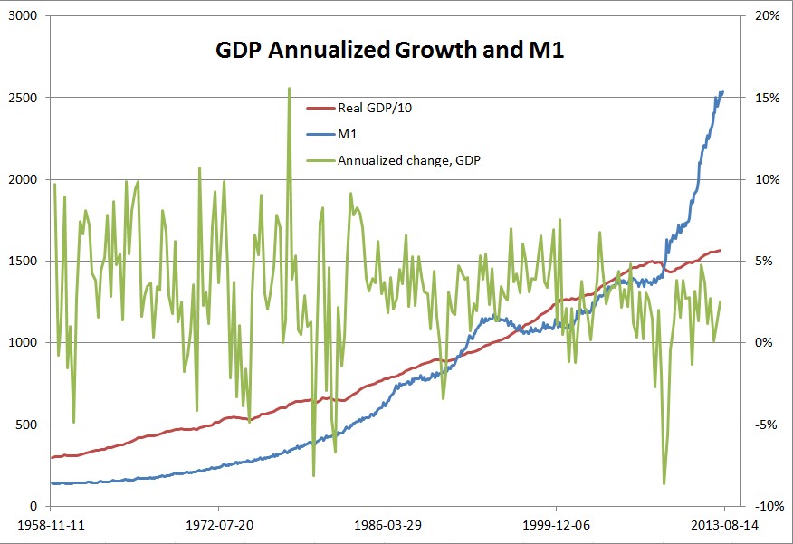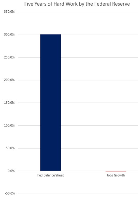 Así pues, los datos muestra que, a pesar del crecimiento exponencial de la masa monetaria (M1) durante la presente crisis, tales inyecciones no han tenido ningún efecto directo sobre la creación real de riqueza y empleo, lo cual evidencia el fracaso de esta estategia por parte de Bernanke, tal y como señala el analista estadounidense Mish Shedlock.