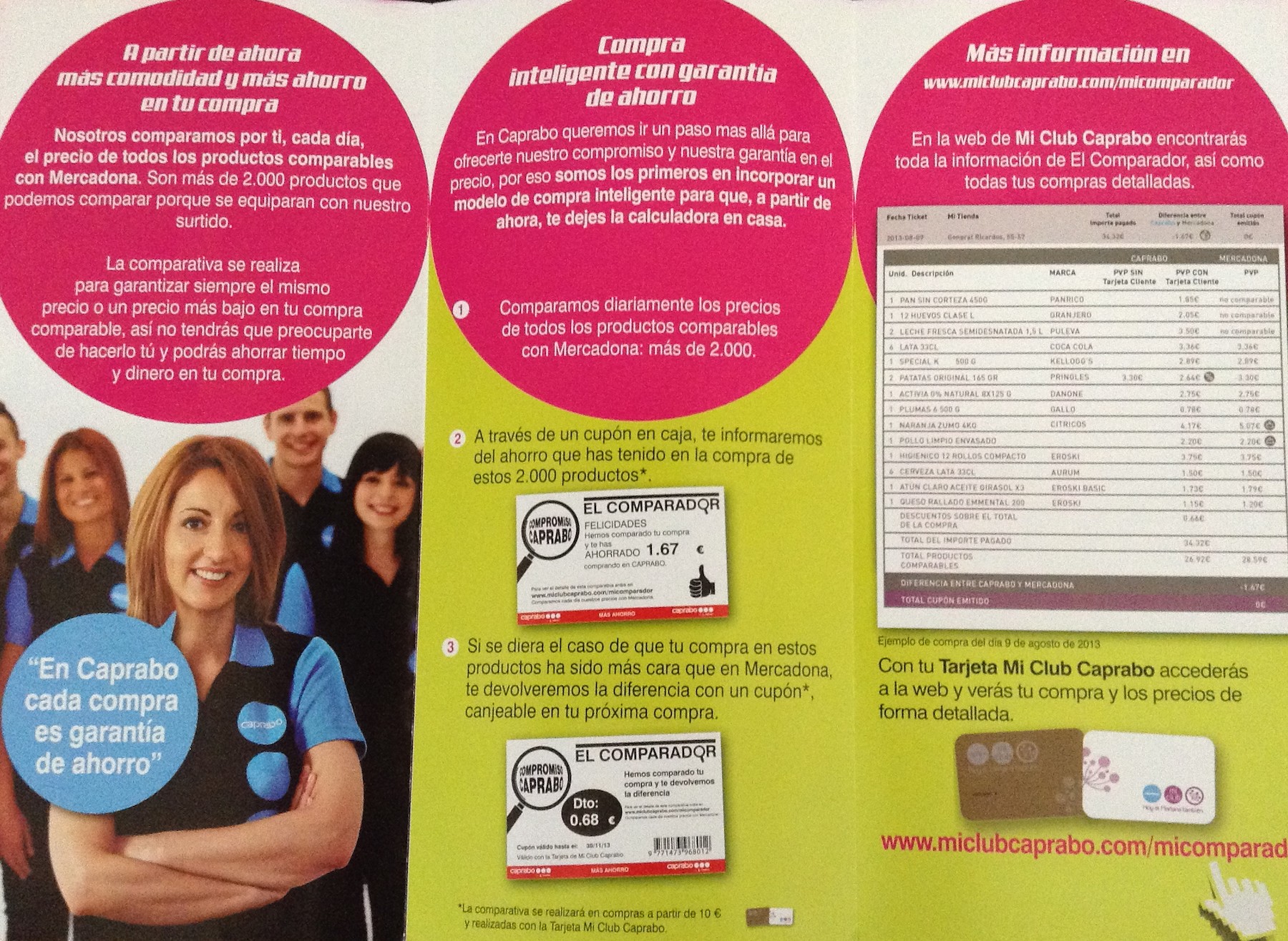 Mediante El Comparador, Caprabo compara de manera automática todos los productos equivalentes con Mercadona en el momento de la compra del cliente. Si la compra de estos productos es más cara en Caprabo de lo que sería en Mercadona, la cadena catalana emite automáticamente un cupón por ese importe para cambiarlo en la siguiente compra.