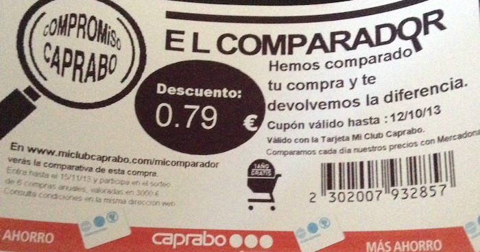 Caprabo ha decidido empapelar con carteles con El Comparador todos sus supermercados con el fin de atraer la atención del cliente. La enseña, perteneciente al Grupo Eroski, compara unas 2.500 referencias de todas las que hay en los lineales del supermercado, lo que no supone una muestra demasiado significativa. De esos 2.500 productos, un 47% son marcas de fabricante, un 35% son productos de marca propia (marca blanca), y, un 18% son referencias de productos frescos. Sin embargo, no se especifica en todos los productos el precio de los mismos, por lo que el consumidor no sabe hasta que pasa por caja cual es el descuento real. Caprabo revisa diariamente los precios disponibles en la página web de Mercadona y compara los productos que coinciden en cada compra.