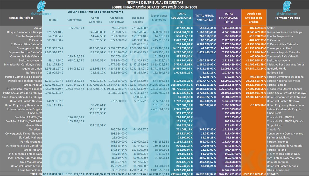 De este modo, excluyendo los créditos vivos, la financiación de los partidos alcanzó los 376,3 millones de euros, un 7% más que en 2007 (cerca de 25 millones extra), procediendo la mayor parte del dinero (casi el 80%) de subvenciones públicas. El siguiente cuadro resume las principales partidas presupuestarias de las formaciones analizadas por el Tribunal de Cuentas.