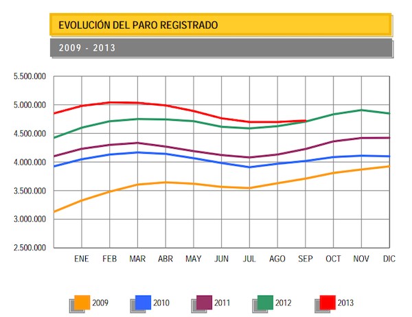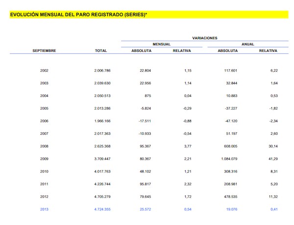 Septiembre es un mes en el que habitualmente sube el desempleo y dentro de la serie histórica, que arranca en 1996, sólo se observa tres descensos, en los años 2005, 2006 y 2007. En igual mes de 2012, el paro subió en 79.645 personas, tres veces más de lo que lo ha hecho en septiembre de 2013.