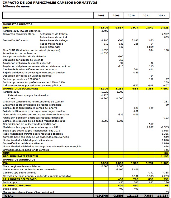 Según Hacienda, el impacto fiscal de todos estos cambios normativos supuso un incremento de la presión fiscal de 12.113 millones en 2010 y otros 7.984 en 2011, lo que hace un total de 20.097 millones de euros.