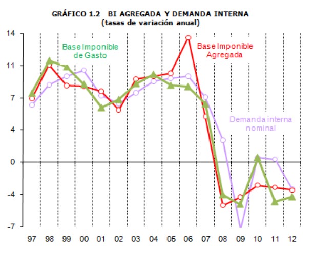 Según los últimos datos de Hacienda, la base imponible total, que engloba las rentas de hogares y empresas y el gasto final, ha descendido un 11,5% entre 2008 y 2012. Además, el volumen de asalariados del sector privado y autónomos sujetos a IRPF se ha desplomado en casi 2 millones de personas, mientras que el beneficio conjunto de las empresas ha caído un 38% durante este período... Sin embargo, los impuestos no han dejado de subir.
