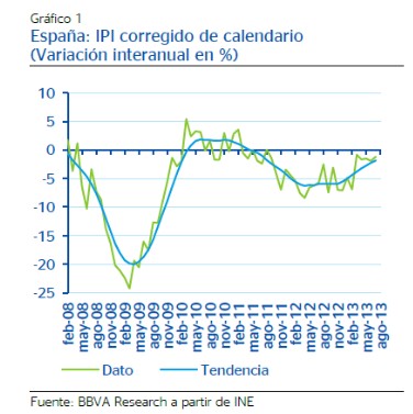 Respecto al inicio de la crisis, la industria española todavía no se habría recuperado. Prácticamente en todos los sectores se ha reducido la producción industrial, excepto en la industria farmacéutica. En términos de valor añadido, la industria se encuentra en un 94,1% de 2008, aunque en el segundo trimestre ha crecido, alcanzando el 95%. A ello, se suma una pobre utilización de su capacidad productiva, de poco más del 70%.