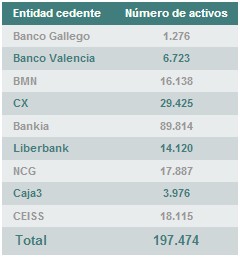 Sareb obtuvo un total de 197.474 activos y créditos procedentes de las entidades del Grupo 1 (BFA-Bankia, Catalunya Caixa, NCG Banco-Banco Gallego y Banco de Valencia) y Grupo 2 (BMN, Liberbank, Caja3 y CEISS). Su objetivo es ir sacando al mercado todos estos activos (créditos y activos reales) a lo largo de los próximos 15 años.
