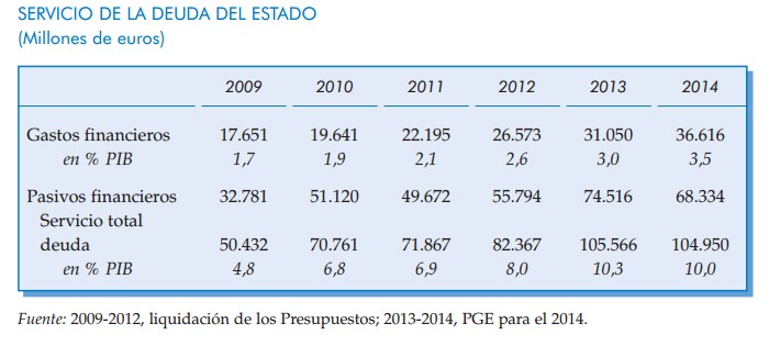 Pero eso no quiere decir que no pesen en la mochila. Para empezar, porque el aumento total de la deuda, aunque se refinancie a sí misma cada año, tiene implicaciones en los años posteriores. Vamos, que cada día habrá que pagar más intereses. Como ya hemos dicho, en 2014 esta partida ascenderá a 36.000 millones. En los PGE, se preveían 38.000 en este concepto. Pero el avance de liquidación apunta a que se quedará en 31.000 millones. Es decir, que habrá un incremento real de más de 5.000 millones sólo en el pago de intereses de la deuda.