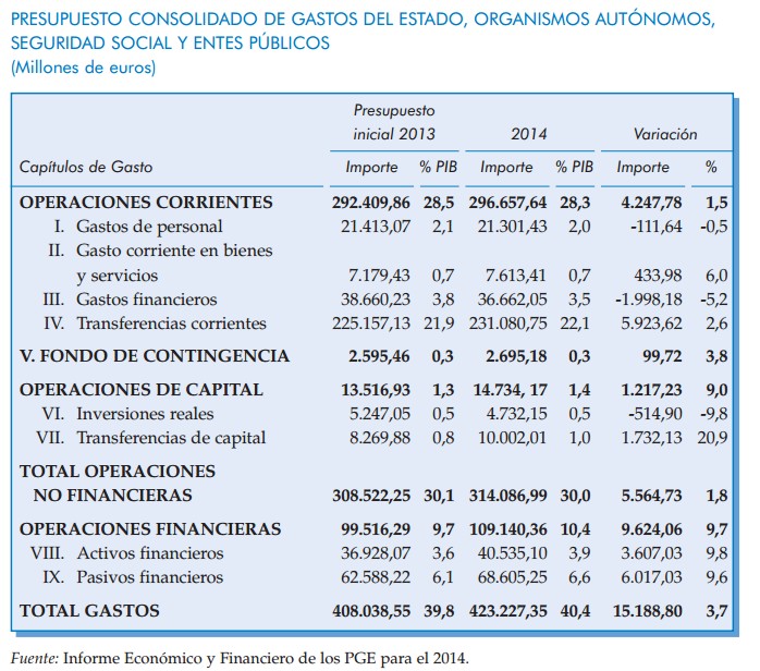 Lo primero que llama la atención son los capítulo de intereses de la deuda, activos financieros y pasivos financieros. Es decir, el servicio de la deuda ya emitida y la refinanciación de la que vence en 2014. La primera partida sumará 36.662 millones y la segunda 68.605 millones. Hablamos de 105.000 millones, un 25% de los PGE destinados sólo a este concepto. Y a esto habría que añadirle los 40.000 millones de activos financieros (básicamente los instrumentos de financiación que el Estado pone a disposición de las comunidades autónomas o para el fondo de rescate europeo).