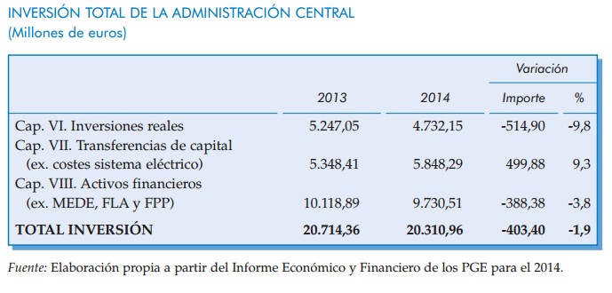 Desde hace años, la única partida que ha ido disminuyendo en los PGE ha sido la de las inversiones reales (capítulo VI). En esta ocasión, de nuevo, se pasa de 5.247 a 4.732 millones, un 9,8% de descenso. El IEE recuerda que la inversión del sector público "no sólo se instrumentaliza por la vía del capítulo VI, sino también por la del capítulo VII (trasnferencias de capital) y capítulo VIII (adquisiciones de activos financieros). Según puede verse en la siguiente tabla, el total de inversión recogido en los PGE apenas cae un 2%.