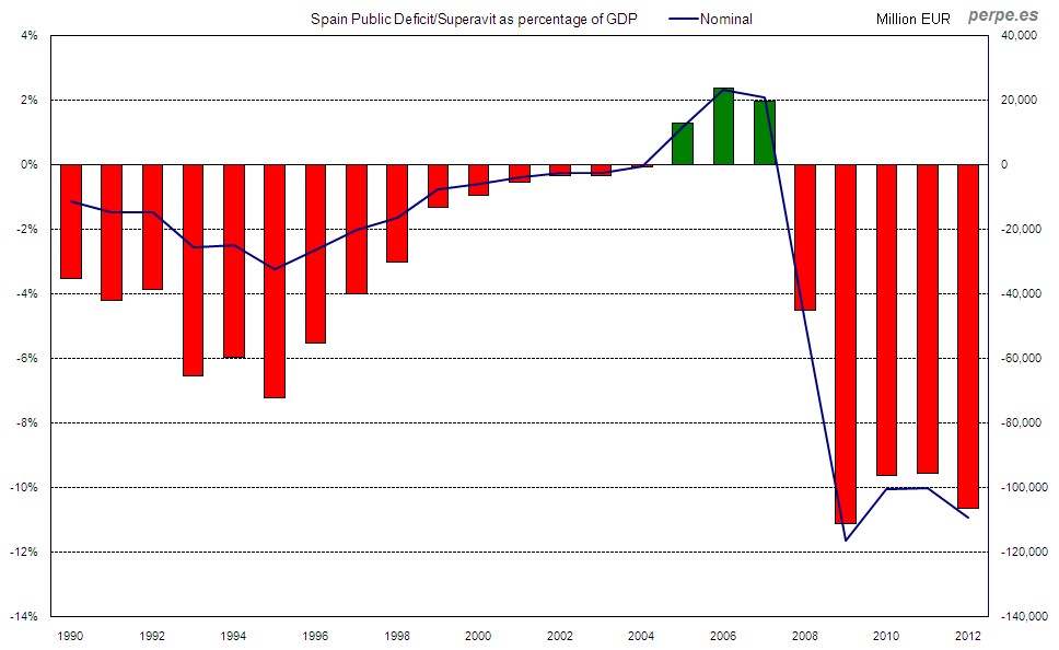 La prueba evidente de estos excesos es el abultado déficit y deuda que sigue presentando el conjunto de las administraciones públicas. España lideró el déficit de toda la UE el pasado año, con un agujero del 10,6% del PIB, incluyendo ayudas financieras, equivalente a más de 100.000 millones de euros. El problema, además, es que el FMI prevé que España no alcance el objetivo del 3% del PIB hasta 2017, un año más tarde de lo acordado con Bruselas.