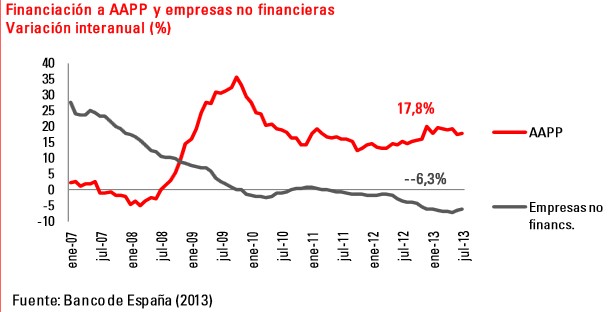 Los analistas del Círculo de Empresarios advierten de que "el crecimiento continuado del endeudamiento público dificulta el acceso a la financiación del sector privado". Como consecuencia, no se ha producido un significativo desapalancamiento de la economía española en su conjunto, lo que dificulta la recuperación del crédito.