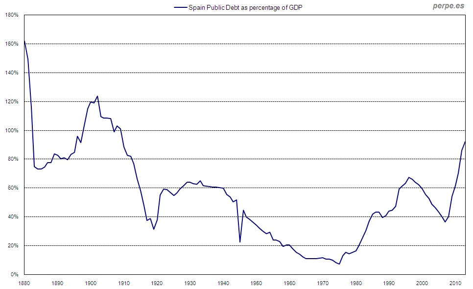 Desde el inicio de la crisis internacional, a mediados de 2007, la deuda pública oficial se ha disparado en 543.858 millones de euros, a un ritmo medio de 250 millones al día, al pasar de casi el 40% del PIB a más del 92% en los últimos seis años, lo que supone un aumento próximo al 130% durante este período.