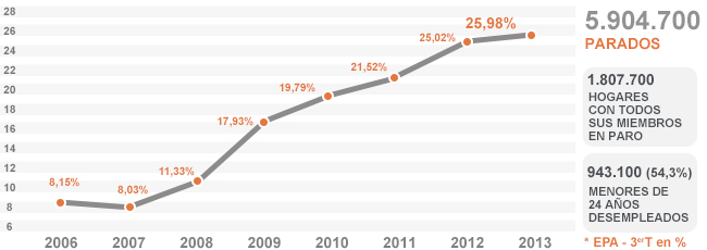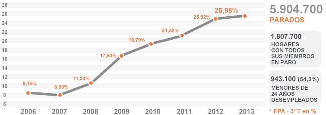 El número de parados bajó en 72.800 personas respecto al segundo trimestre (-1,2%), hasta situarse en un total de 5.904.700, el mayor descenso registrado en este período desde 2005. De este modo, la tasa de paro baja 0,28 centésimas, hasta el 25,98%, por segundo trimestre consecutivo, lo cual no sucedía desde 2006. Mientras, a nivel interanual, el volumen de desempleados aumenta en 126.700 personas (2,19%), pero se trata de un ritmo muy inferior al del pasado año.