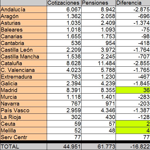 La siguiente tabla recoge en millones de euros los ingresos por cotizaciones sociales y el gasto en pensiones contributivas de cada comunidad autónoma entre enero y agosto de 2013, así como la diferencia entre ambas cantidades.