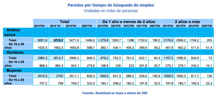 En concreto, en el tercer trimestre de 2013 el número de parados ascendía a 5.576.400, de los que el 62% se encontraba buscando empleo desde hacía más de un año, unas 3.439.900 personas, según los datos recogidos por Randstad a partir de la última EPA. De éstos, llevaban dos años o más intentando conseguir un trabajo unos 2.165.100 (39% del total de desempleados), y entre 12 meses y menos de dos años unas 1.275.700 (23% del total).