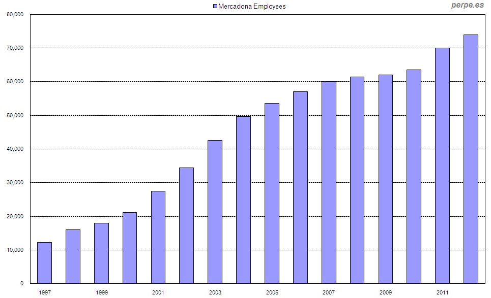 El grupo contaba el pasado año con una plantilla total de 74.000 empleados, todos ellos con contrato fijo, multiplicando por seis su plantilla desde 1997 y creando 14.000 puestos durante la crisis. Y a ello cabe sumar el elevado empleo indirecto que genera su actividad a través de sus proveedores, de modo que casi 400.000 personas dependen de una u otra forma de Mercadona.