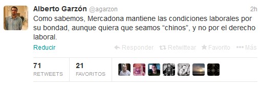 Ante tal comentario, un tuitero preguntó a Garzón: "¿Es malo ser chino?". Y por si aún no había quedado claro, éste respondió lo siguiente: "Si en el contexto significa estar mucho más explotado, usted verá". De hecho, en la mañana de este jueves, el diputado de IU ha continuado argumentando su crítica contra Roig y Mercadona: "Como sabemos, Mercadona mantiene las condiciones laborales por su bondad, aunque quiera que seamos chinos, y no por el derecho laboral".