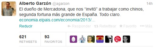 Tras conocerse la noticia, Alberto Garzón, diputado de Izquierda Unida (IU), publicaba el siguiente comentario en su cuenta personal en Twitter: "El dueño de Mercadona, que nos invitó a trabajar como chinos, segunda fortuna más grande de España. Todo claro".