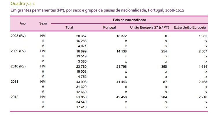De las 121.418 personas que optaron por abandonar Portugal, un total de 116.926 eran de nacionalidad portuguesa. De esta cuantía, se estima que en 2012 han dejado Portugal para vivir en el extranjero por un plazo igual o superior a un año 49.458 portugueses.