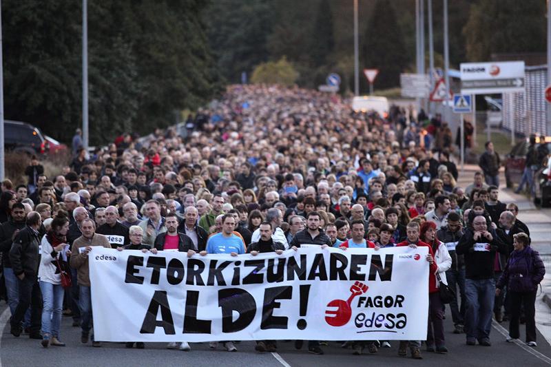 Miles de personas han participado este jueves en Arrasate (Guipúzcoa) en una manifestación convocada por los órganos representativos de Fagor Electrodomésticos para exigir el mantenimiento del empleo de la cooperativa vasca, que se encuentra al borde del concurso de acreedores. La manifestación ha partido desde la planta de Fagor Electrodomésticos del barrio de San Andrés de Arrasate, tras una pancarta en euskera en la que se podía leer "A favor del futuro", firmada por Fagor y Edesa, la planta del grupo ubicada en la localidad vizcaína de Basauri.