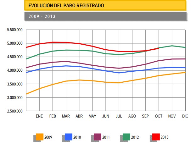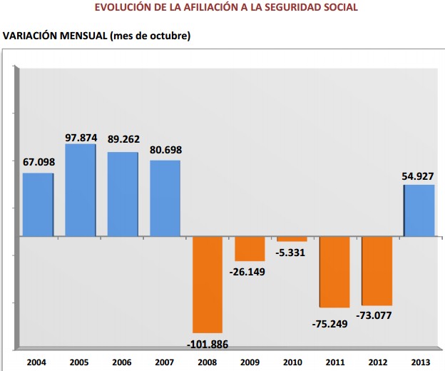Sin embargo, lo más relevante es que el paro registrado cayó en 22.138 personas respecto a octubre de 2012 (-0,46%). Se trata del primer descenso interanual desde mayo de 2007, y el primero que acontece en un mes de octubre desde 2006, cuando bajó en 60.025 personas (-2,92%). Además, esta bajada contrasta de forma sustancial con el fuerte aumento interanual que se viene registrando en octubre desde que estalló la crisis, con un incremento medio de 557.000 personas. Cabe recordar que hace un año el desempleo crecía a una tasa anual próxima al 11%, y ahora, por el contrario, baja a nivel interanual.