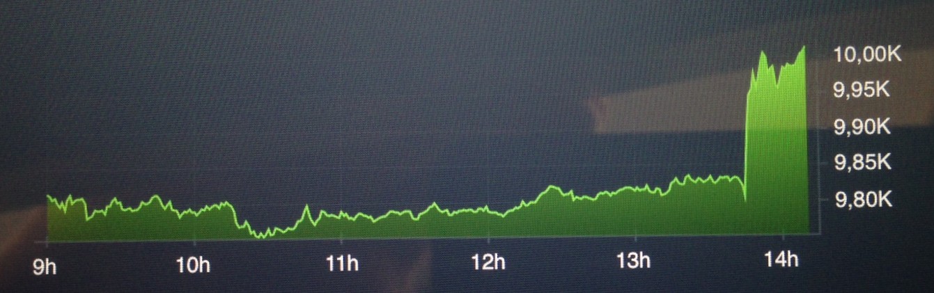 Y en ese momento comenzaba una nueva mini-jornada completamente alocada. En los primeros minutos, el Ibex 35 se disparaba, olvidaba las pérdidas de comienzo de la sesión y llegaba a anotarse un incremento del 1,65% (superando los 10.000 puntos) se anotaba un 1,65% tras conocer la noticia. Minutos antes, cotizaba unas décimas en negativo. Sin embargo, la alegría no duraba mucho y poco después de las 15.00 horas, el principal índice español estaba de nuevo en terreno negativo.